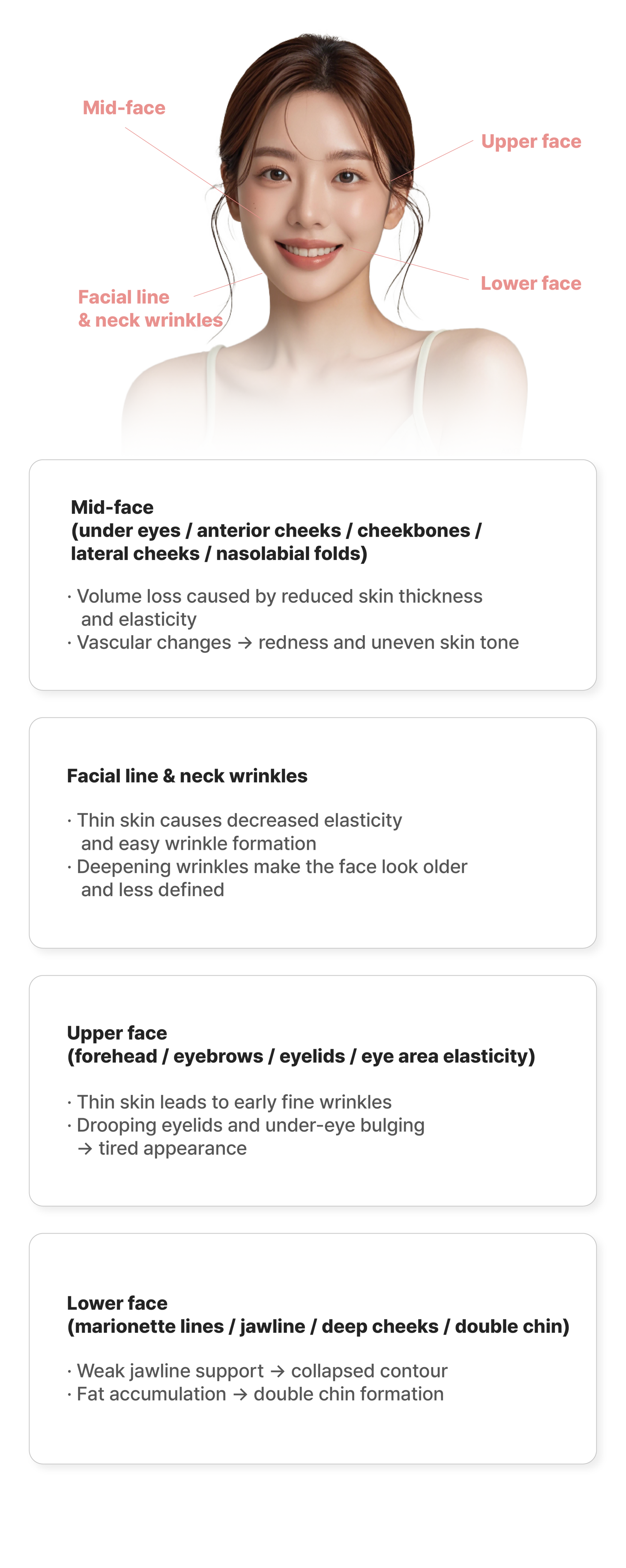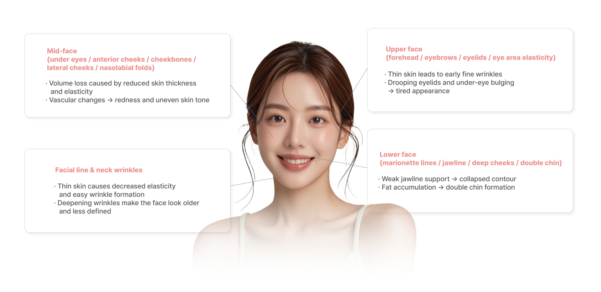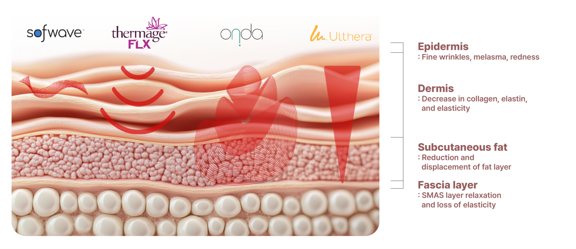 Skin aging does not occur in a single layer but progresses across multiple layers — epidermis, dermis, subcutaneous fat, and the SMAS layer.