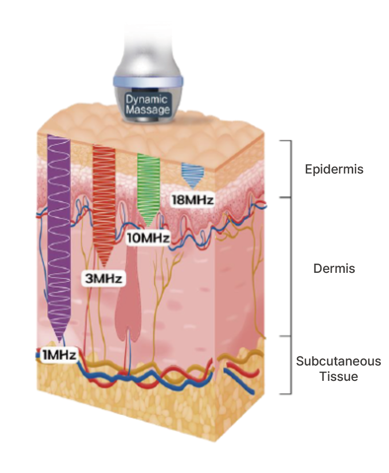 By generating four different ultrasound frequencies in an alternating pattern, it simultaneously treats all skin layers, from the epidermis to the deep dermis, helping to restore skin to its optimal condition.